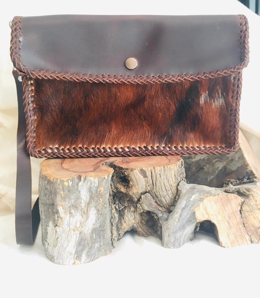 Elaborado en piel de vaca engrasada y piel natural sin rasurar el pelo. La forma de curtir que Yola utiliza en sus productos es vegetal, no se utilizan químicos evitando contaminar las aguas de nuestros ríos al teñir.